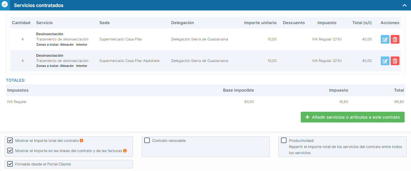importe de cada uno de los servicios que hemos ido agregando.