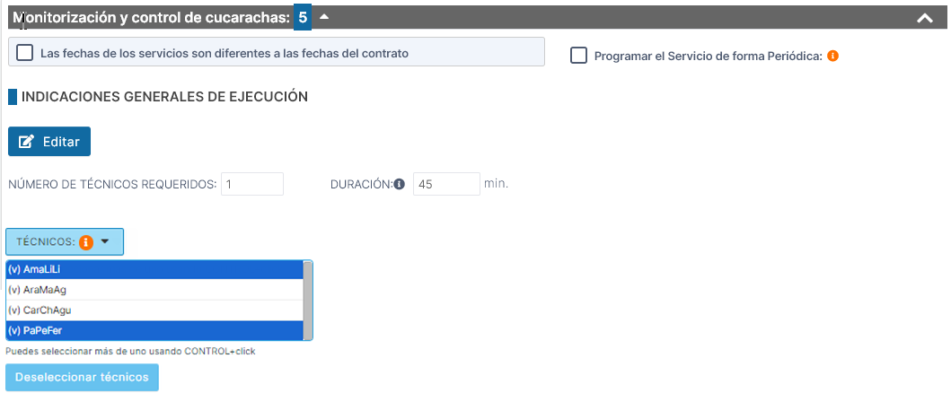la tarea a realizar y el número de técnicos necesarios para cumplir con ese