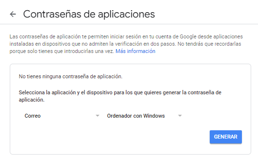 B) Seleccionamos la aplicación o dispositivo en cual queremos generar la contraseña de app y clicamos en generar