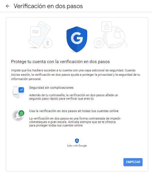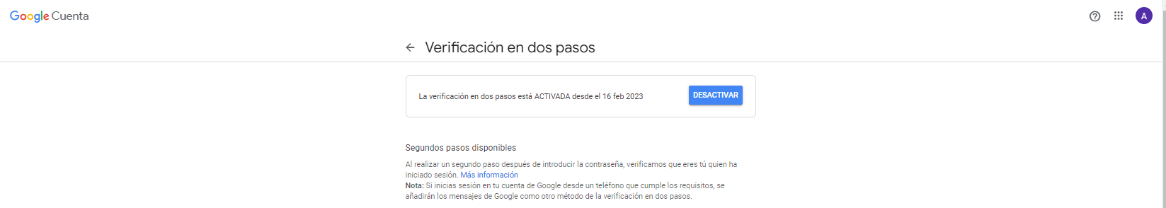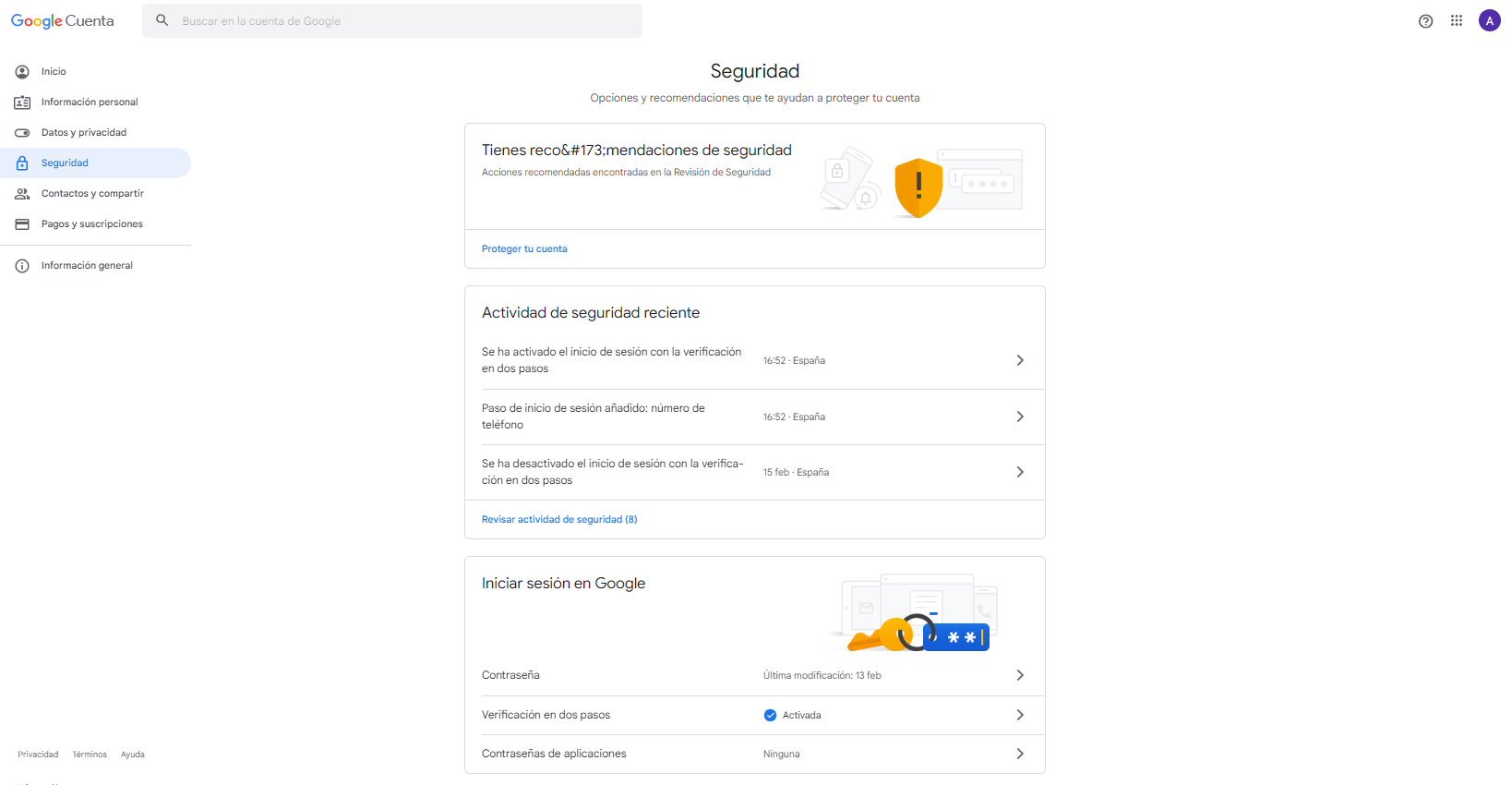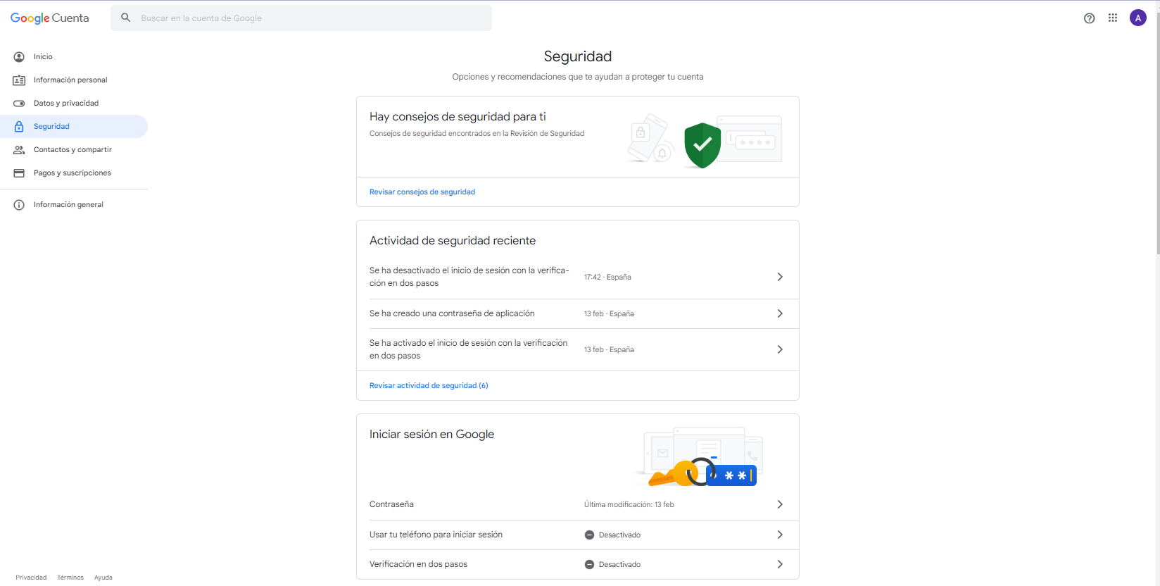 Vamos al apartado Seguridad > iniciar sesión en Google y clicamos en el icono