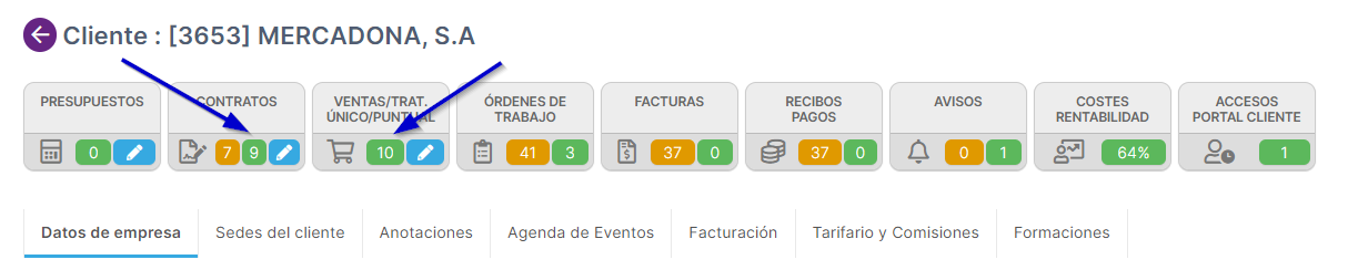 1. Debemos ingresar en la ficha del cliente > Ventas / Trat. Único / Puntual o Contratos > Consultar una existente o crear una nueva venta.