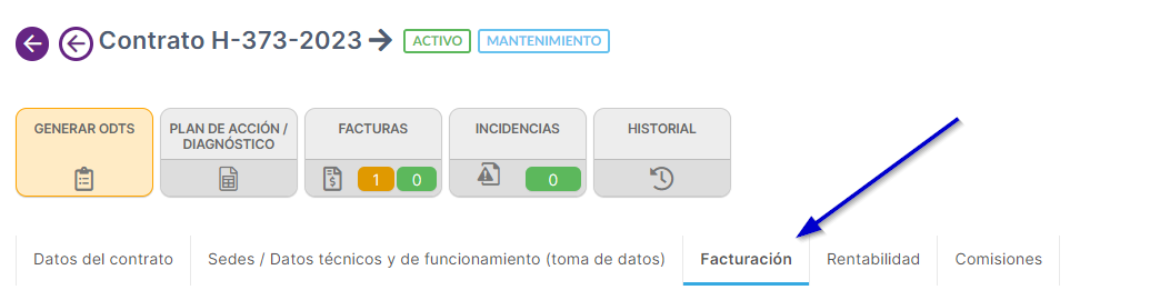 2. Dentro de la ficha de cada venta / contrato, encontraremos un apartado denominado albaranes > debemos pinchas en el desplegable para verificar más opciones. En el caso de los contratos, debemos acceder primero a la pestaña facturación.
