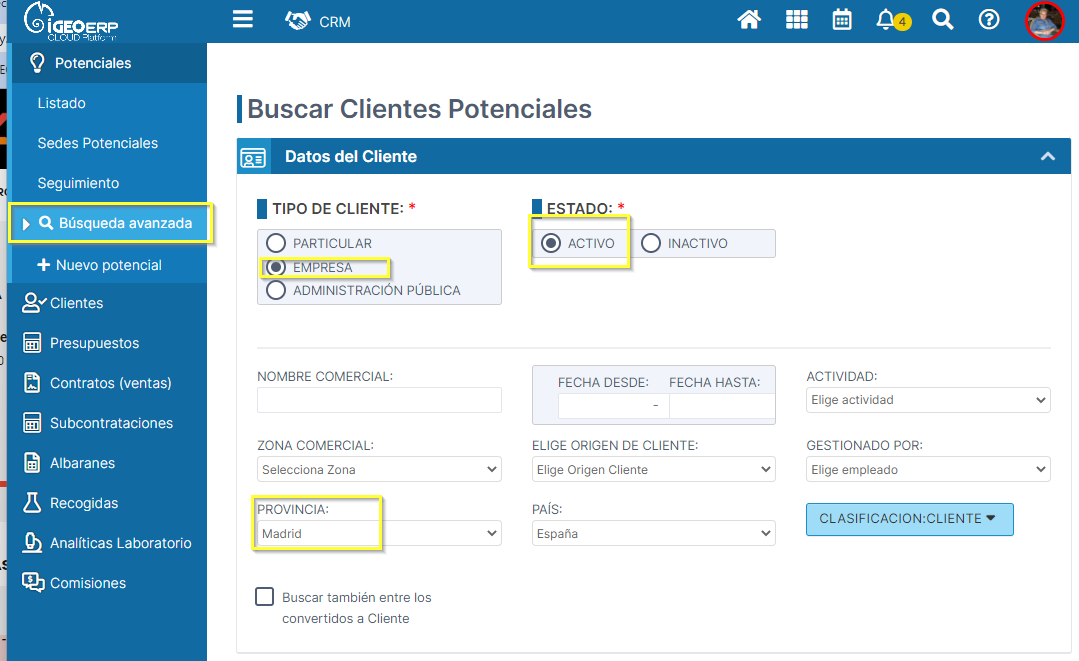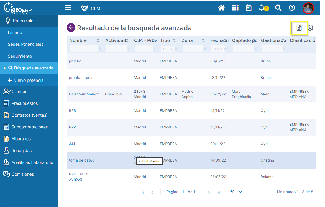 Estos filtros nos permiten realizar búsquedas mas exhaustivas que el resto. Ejemplo en este caso seleccionamos activos y de la línea de negocio de control de plagas. El resultado se puede exportar a excel. Si selecionamos la lupa podremos volver a ...