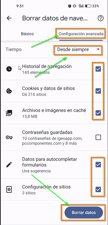 Seleccionamos Configuración Avanzada, Desde Siempre y todos* los selectores antes de pulsar Borrar.