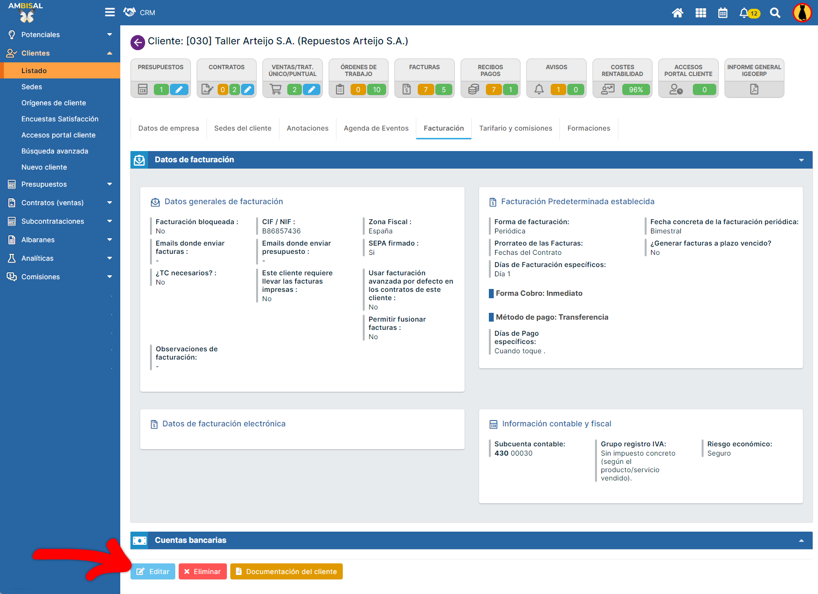 Para configurar la facturación de un cliente, debemos acceder a susDatos de facturación. Para ello, debemos