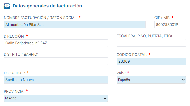 En la sección Datos generales de facturación,