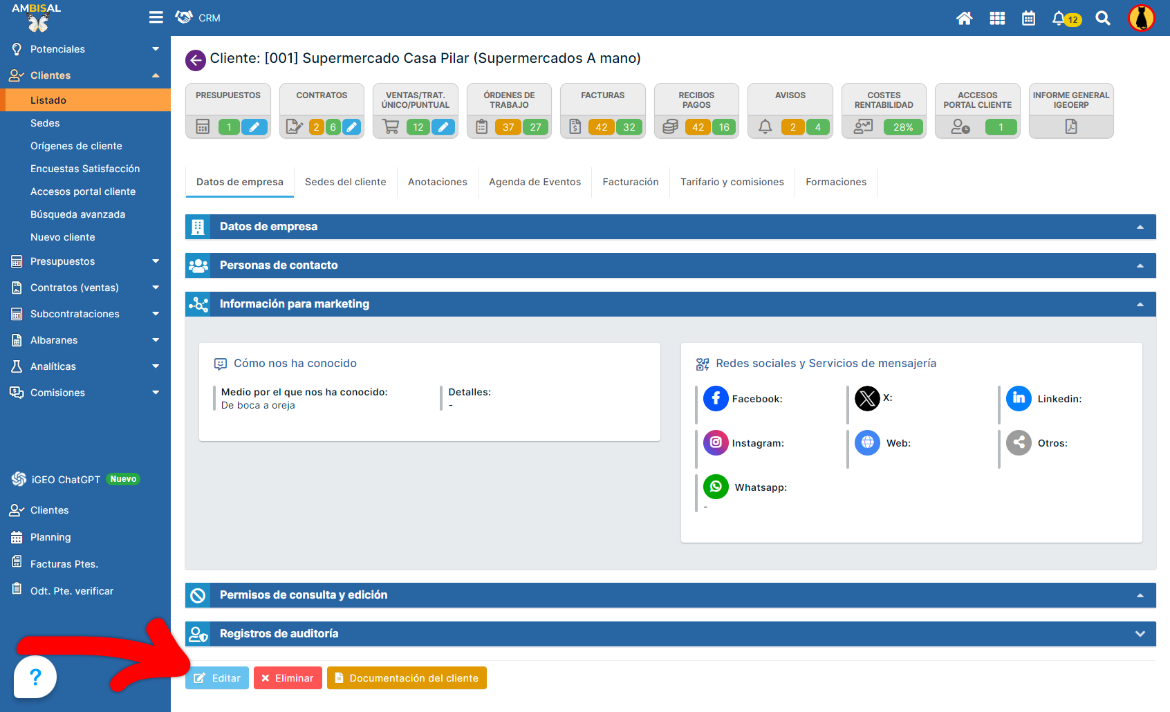 Para editar la Toma de datos de cada sede de un contrato, lo primero que debemos hacer es abrir el módulo CRM. A continuación, desplegamos Clientes, buscamos el cliente en el listado, y abrimos su ficha pulsando sobre su nombre. Después, accedemos a ...