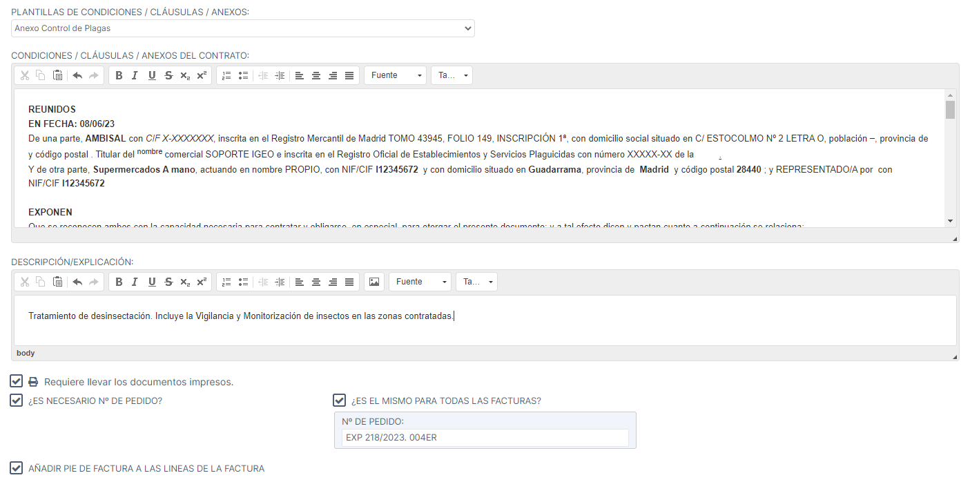 dado de alta en el apartado Cláusulas/Anexos de la configuración