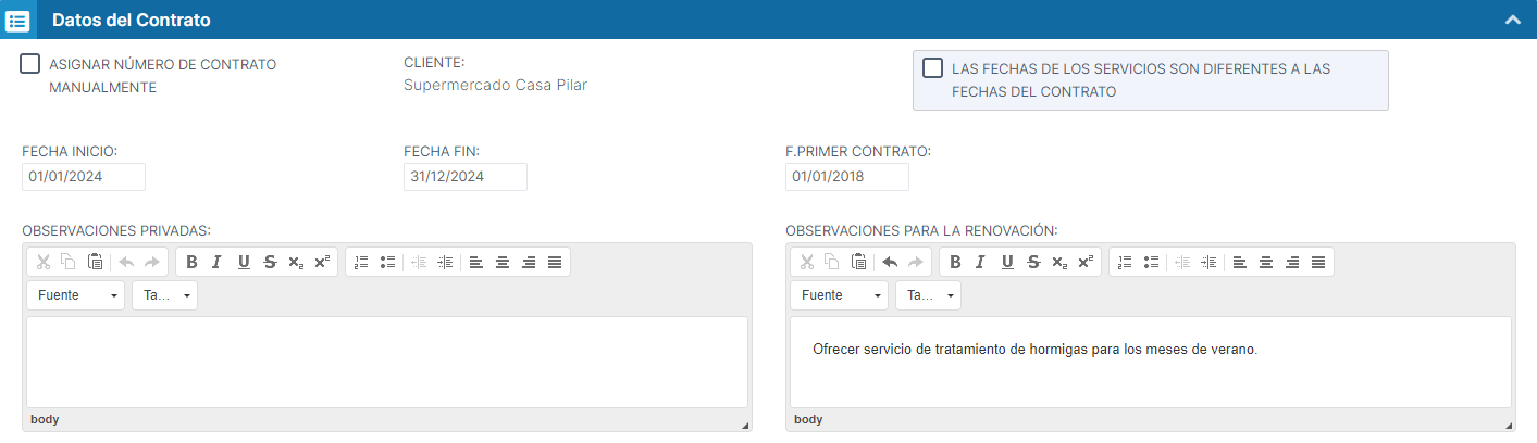 fechas del contrato. Si marcamos esta casilla, podremos establecer
