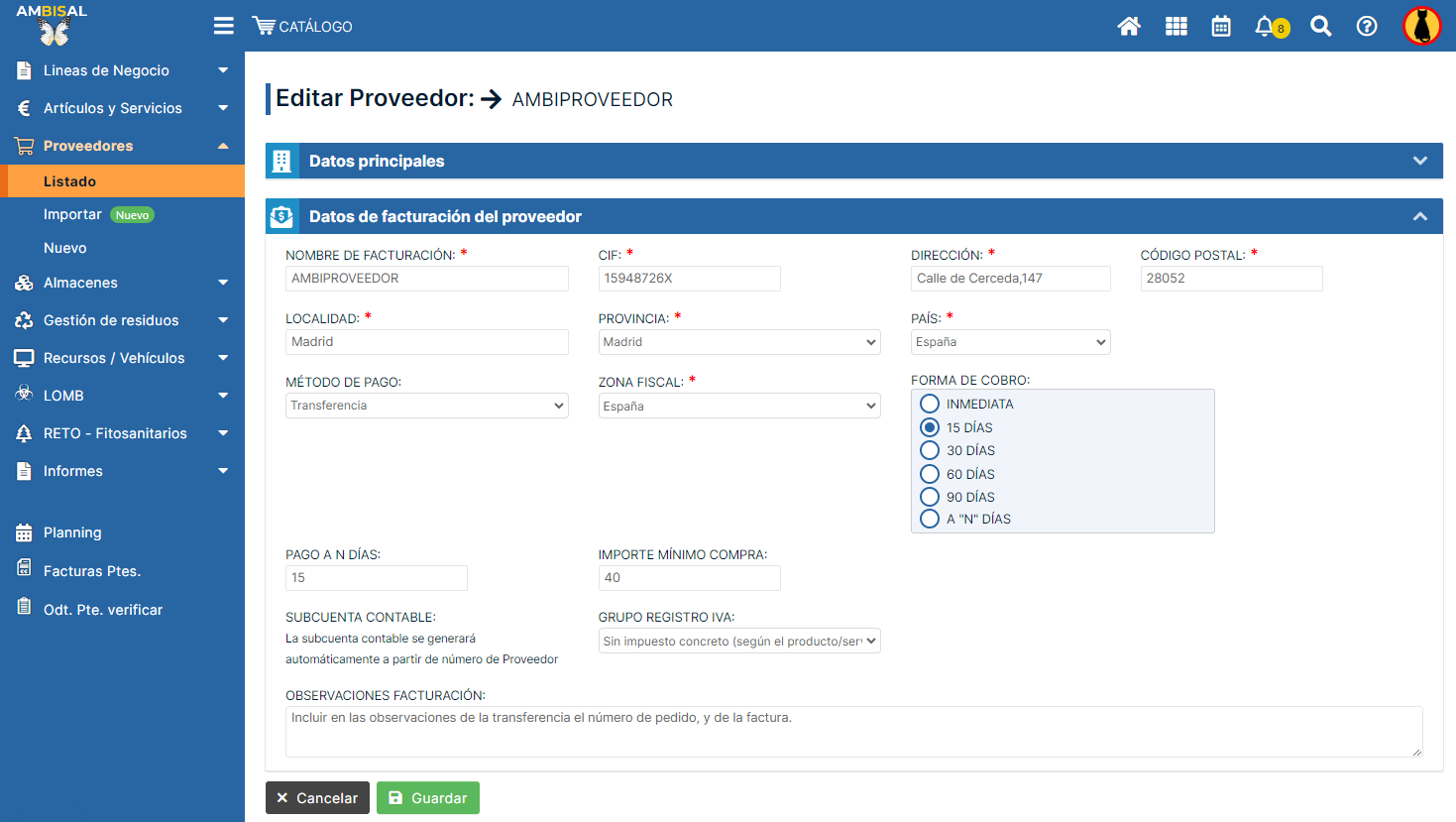 sección Datos de facturación del proveedor, debemos rellenar