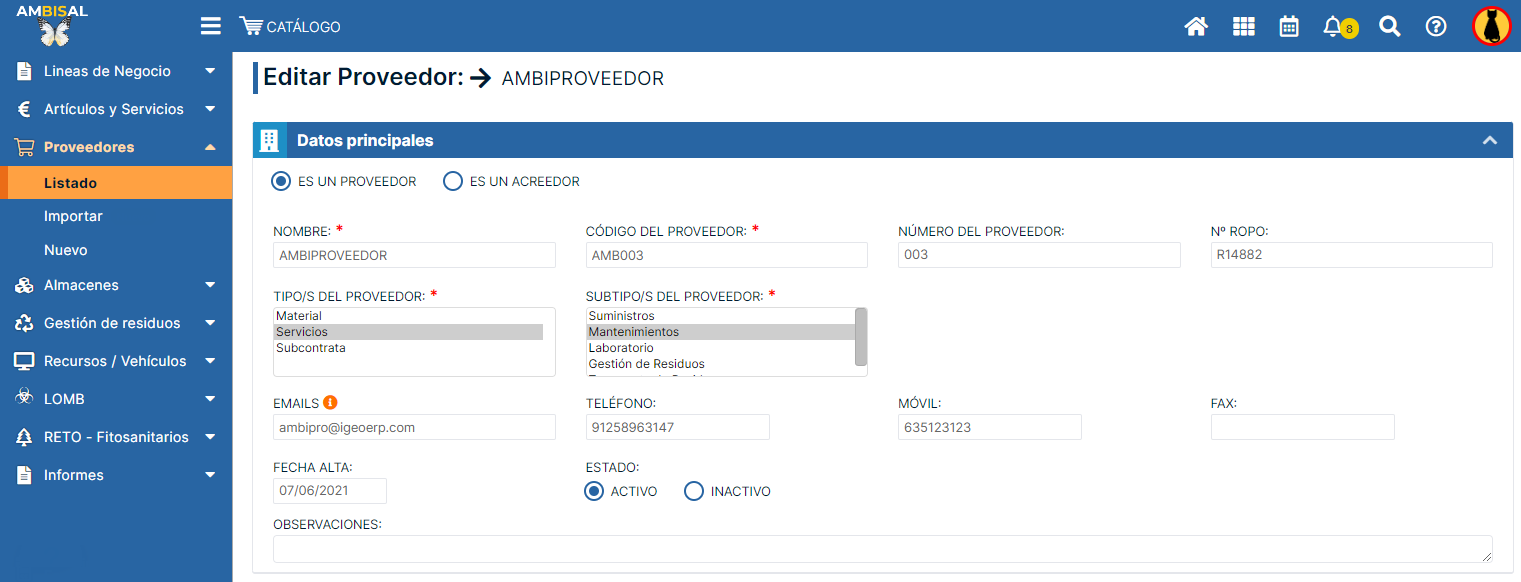 forma, la plataforma nos muestra la ficha del proveedor,