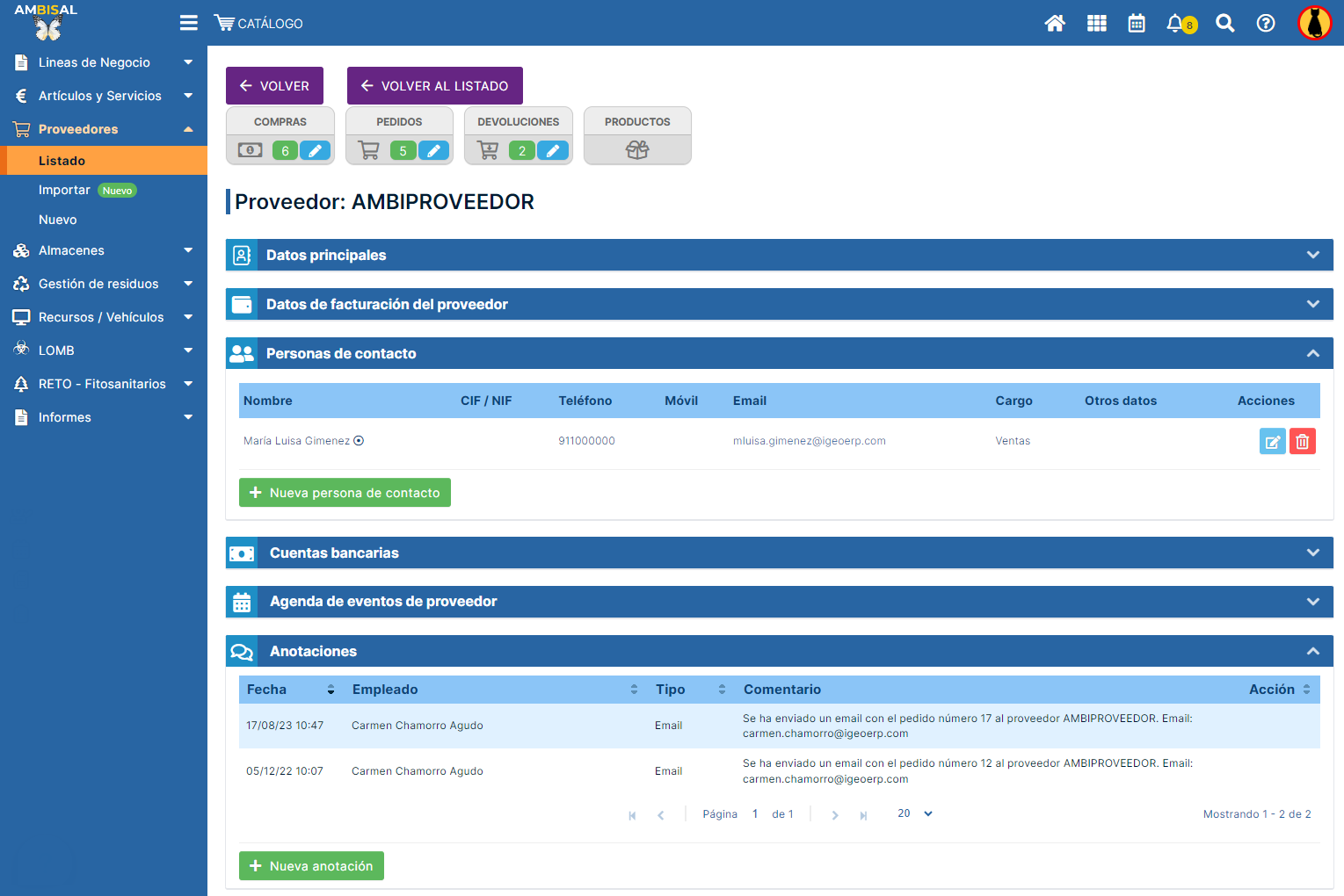 que nos vinculan con ese proveedor. De este modo, habremos terminado de agregar los datos de nuestro proveedor iGEO y podremos gestionar nuestra relación comercial con él, dejando registros a nivel contable y logístico de esa actividad.