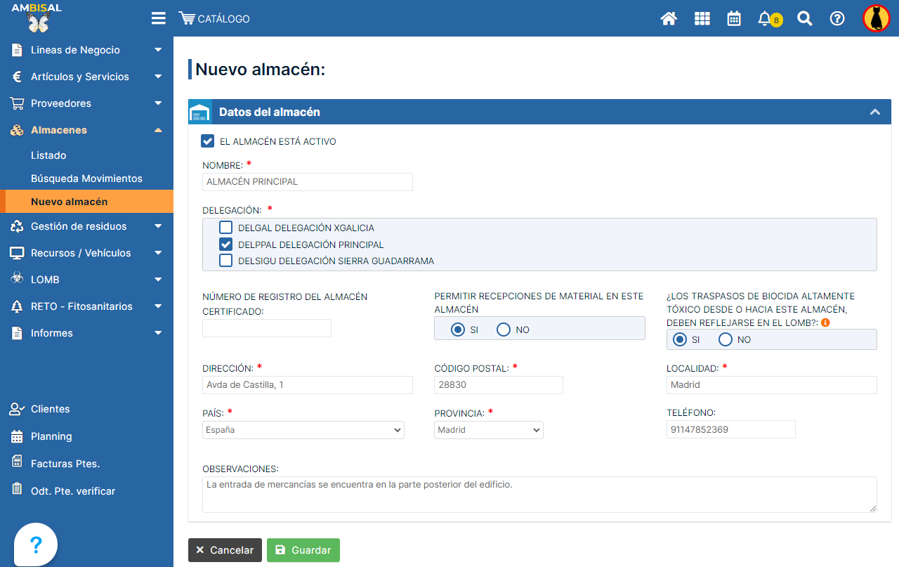 los movimientos de biocidas en este almacén. Si creamos almacenes