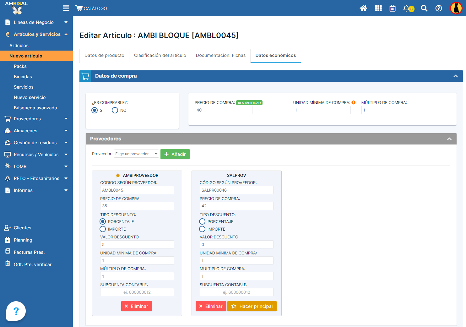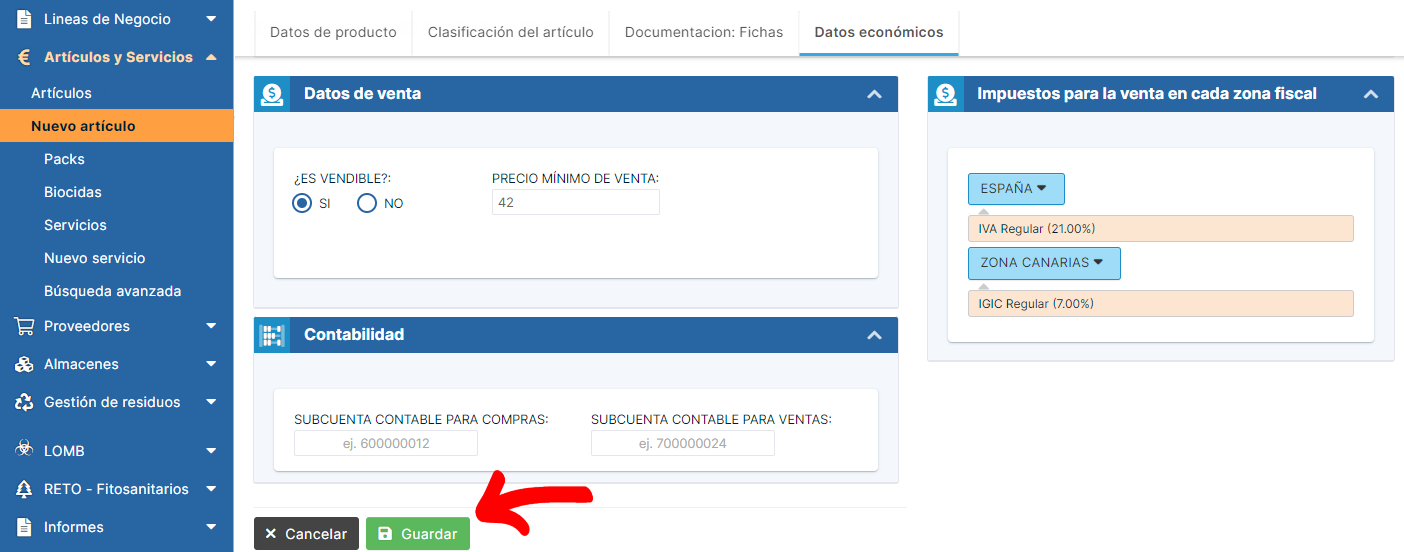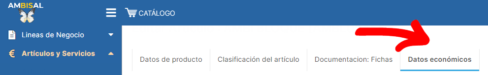 Para registrar un nuevo artículo o modificar uno que ya existe, abrimos el módulo catálogo almacenes, y desplegamos el apartado Artículos y servicios. Según el caso, pulsamos Nuevo artículo, o abrimos la ficha del artículo y pulsamos el botón Editar. ...