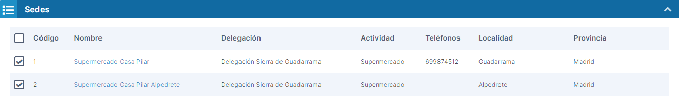 En la sección Sedes, debemos seleccionar una o varias sedes