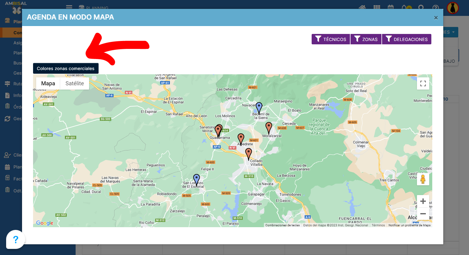 delegación y zonas comerciales), o cambiar el modo de visualización para