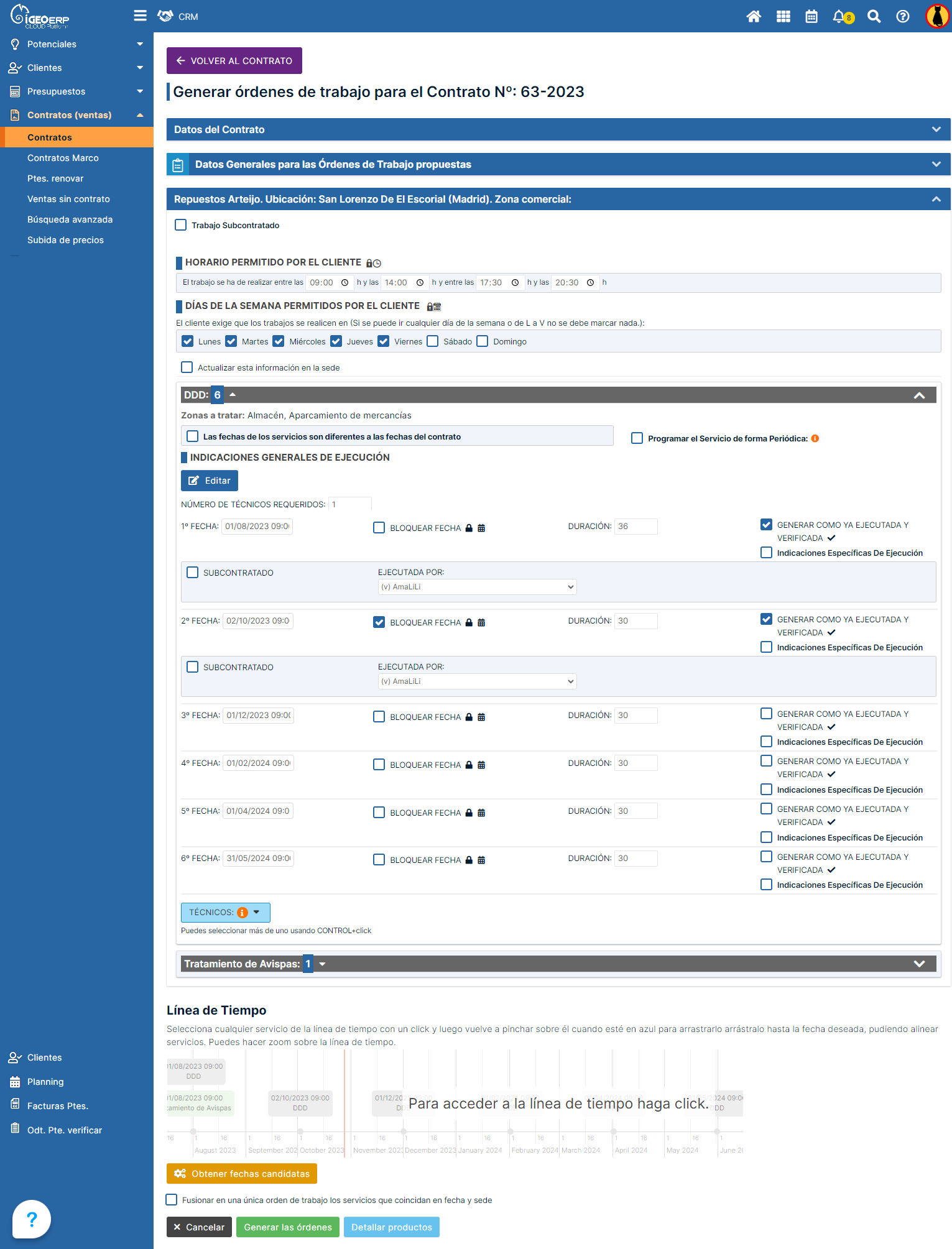 Durante el proceso de generación de las Órdenes de trabajo de un contrato, la plataforma nos ofrece la posibilidad de marcar la casilla Fusionar en una única orden trabajo los servicios que coincidan en fecha y sede. Si marcamos esta casilla, iGEO ...