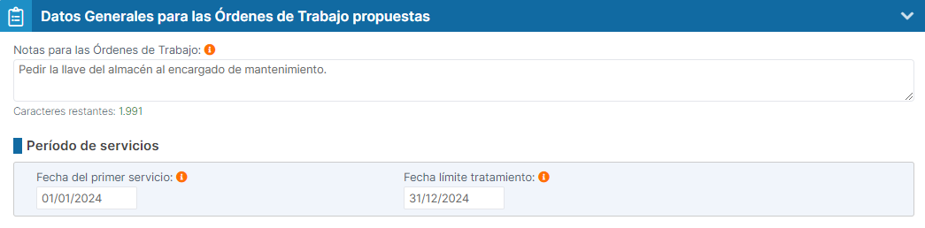 configurar una Nota interna para las Órdenes de Trabajo, así como la Fecha del primer servicio