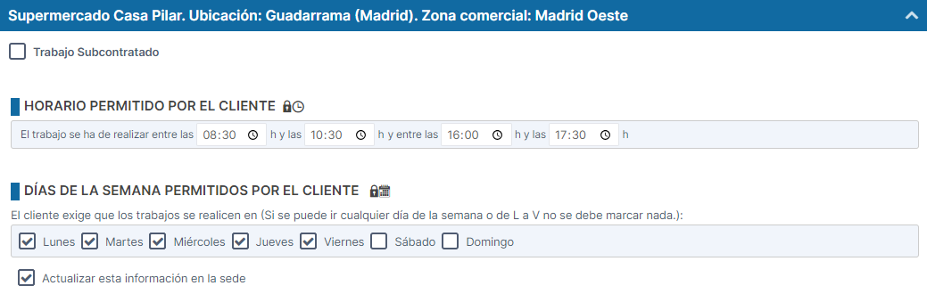 Estos campos pueden completarse para cada sede o dirección de servicio incluida en el