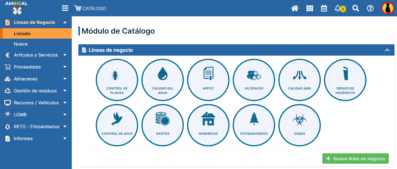 Una Línea de negocio en iGEO. se refiere a cada una de las áreas de actividad en el campo de la sanidad ambiental. En iGEO, todos los elementos como artículos y servicios, los presupuestos o los contratos y las órdenes de trabajo están asociados con una Línea de negocio específica.