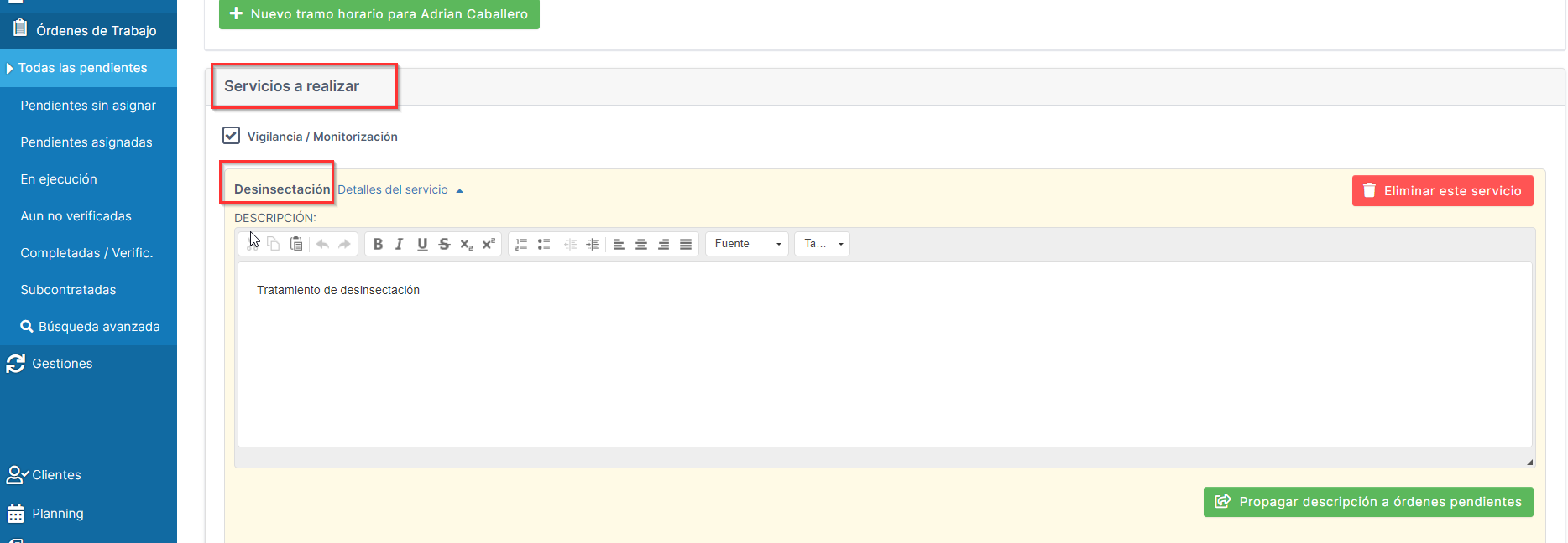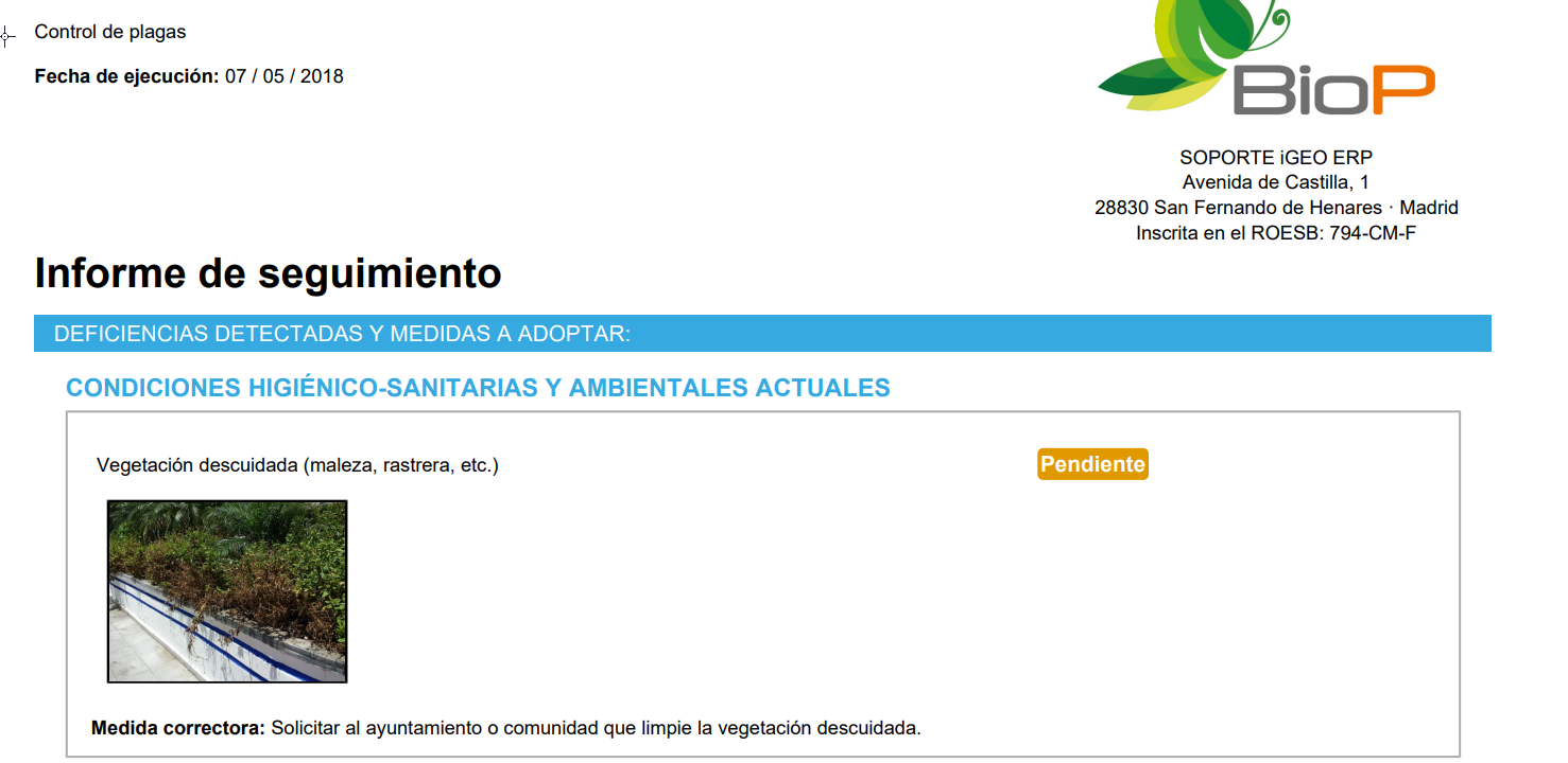 Para que entonces la deficiencia aparezca en el certificado, tendremos que fijarnos en los servicios realizados en la orden (en el ejemplo de abajo "Desinsectación")