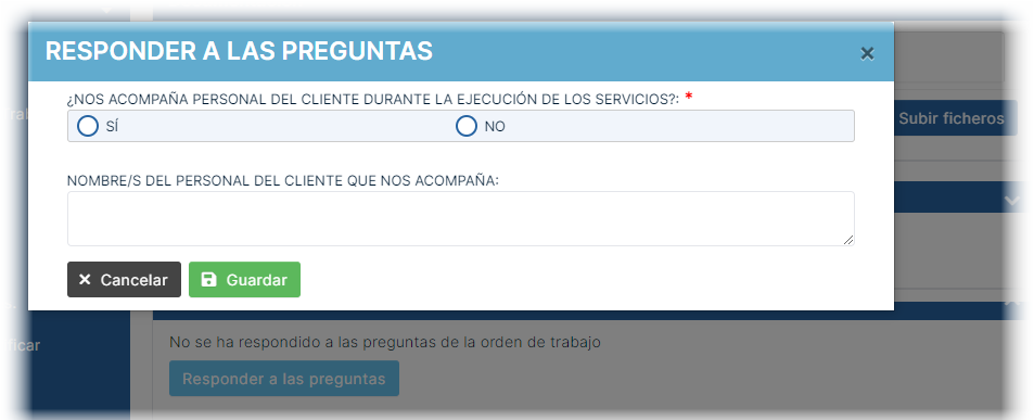 Las Preguntas para una Orden de Trabajo son elementos que podemos crear y configurar en iGEO para incluir en todas las órdenes de trabajo de una Línea de negocio específica. Estas preguntas permiten recopilar información adicional y personalizada ...