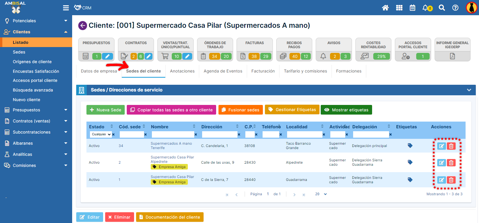 Para registrar o modificar los datos de la Sede de un cliente, debemos abrir el módulo CRM, desplegar Clientes, abrir la ficha del cliente cuyos datos queremos modificar, situarnos en la pestaña Sedes, y pulsar el botón Editar de la sede que queremos ...