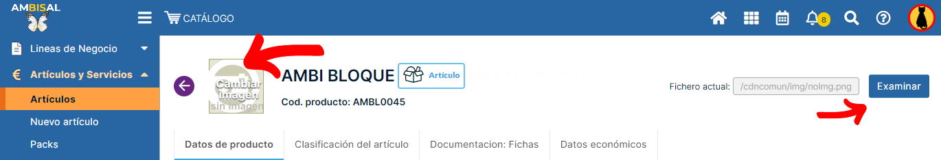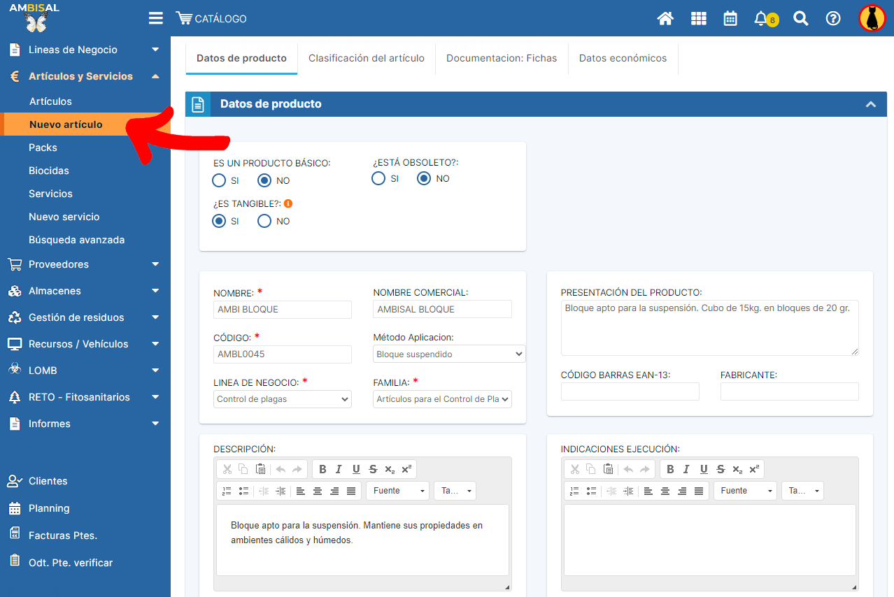 Para registrar un nuevo artículo o modificar uno que ya existe, abrimos el módulo catálogo almacenes, y desplegamos el apartado Artículos y servicios. Según el caso, pulsamos Nuevo artículo, o abrimos la ficha del artículo y pulsamos el botón Editar. ...