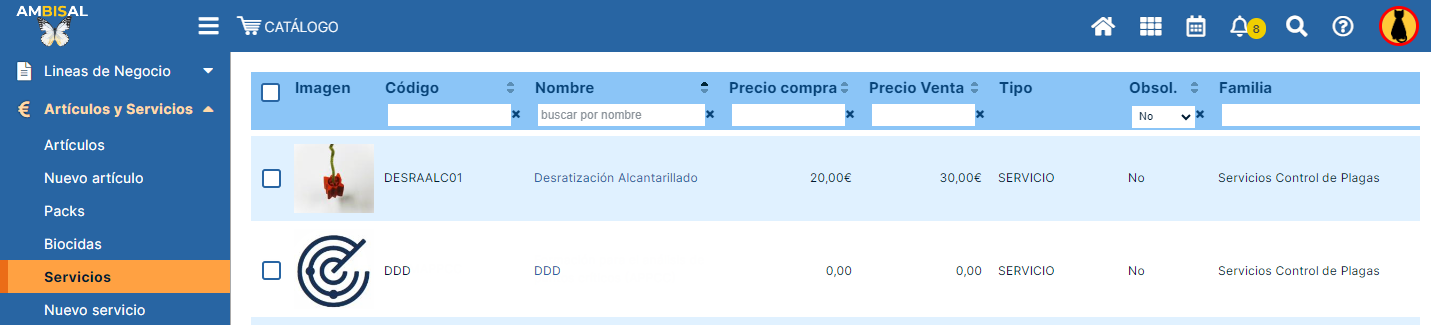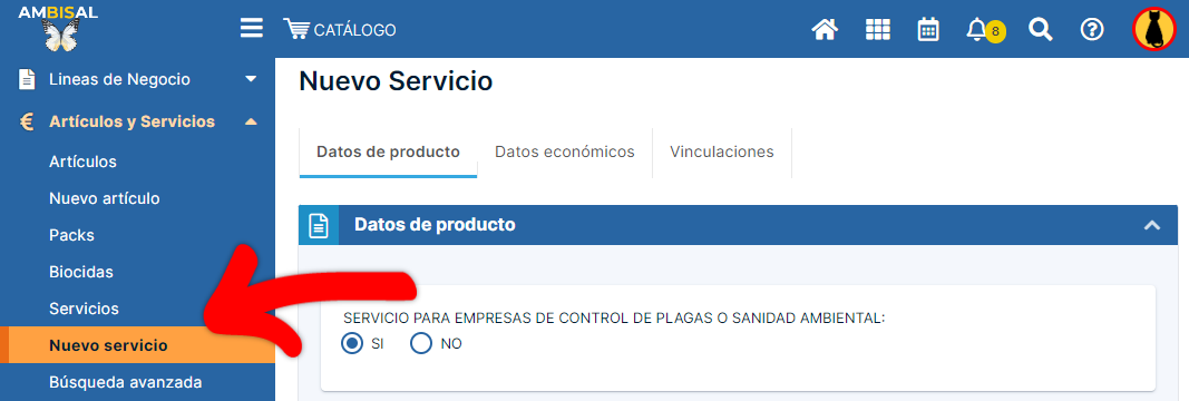 registrar un nuevo servicio, abrimos el módulo catálogo