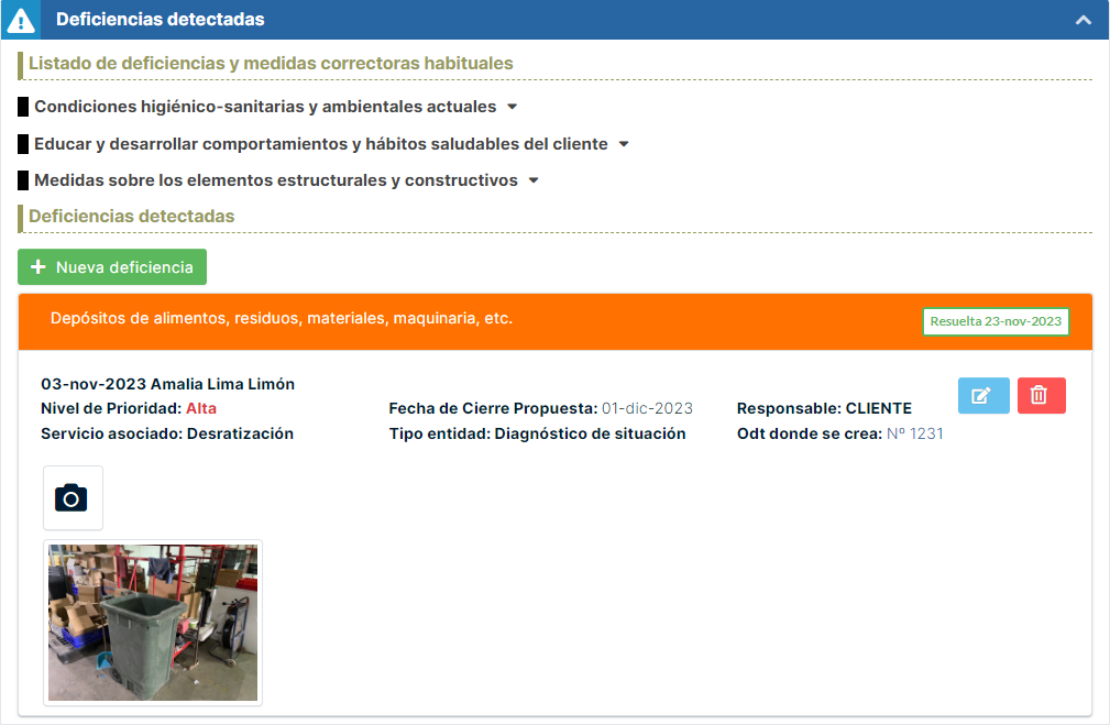 personalizada con el botón + Nueva deficiencia.